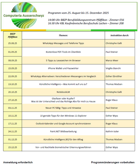 Die Computeria Ausserschwyz bietet der Generation 50plus die Möglichkeit, in entspannter Atmosphäre ihre IT Kenntnisse zu vertiefen. Das Angebot umfasst Workshops zu Themen von Microsoft Office, webbasierten Anwendungen, Smartphone Apps oder Künstlicher Intelligenz.